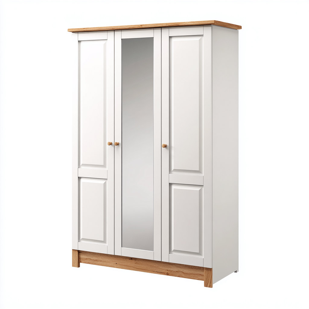 Questo armadio moderno a tre ante con corpo bianco e dettagli in legno naturale integra un'anta centrale con specchio, offrendo una soluzione elegante per organizzare gli spazi della zona notte.