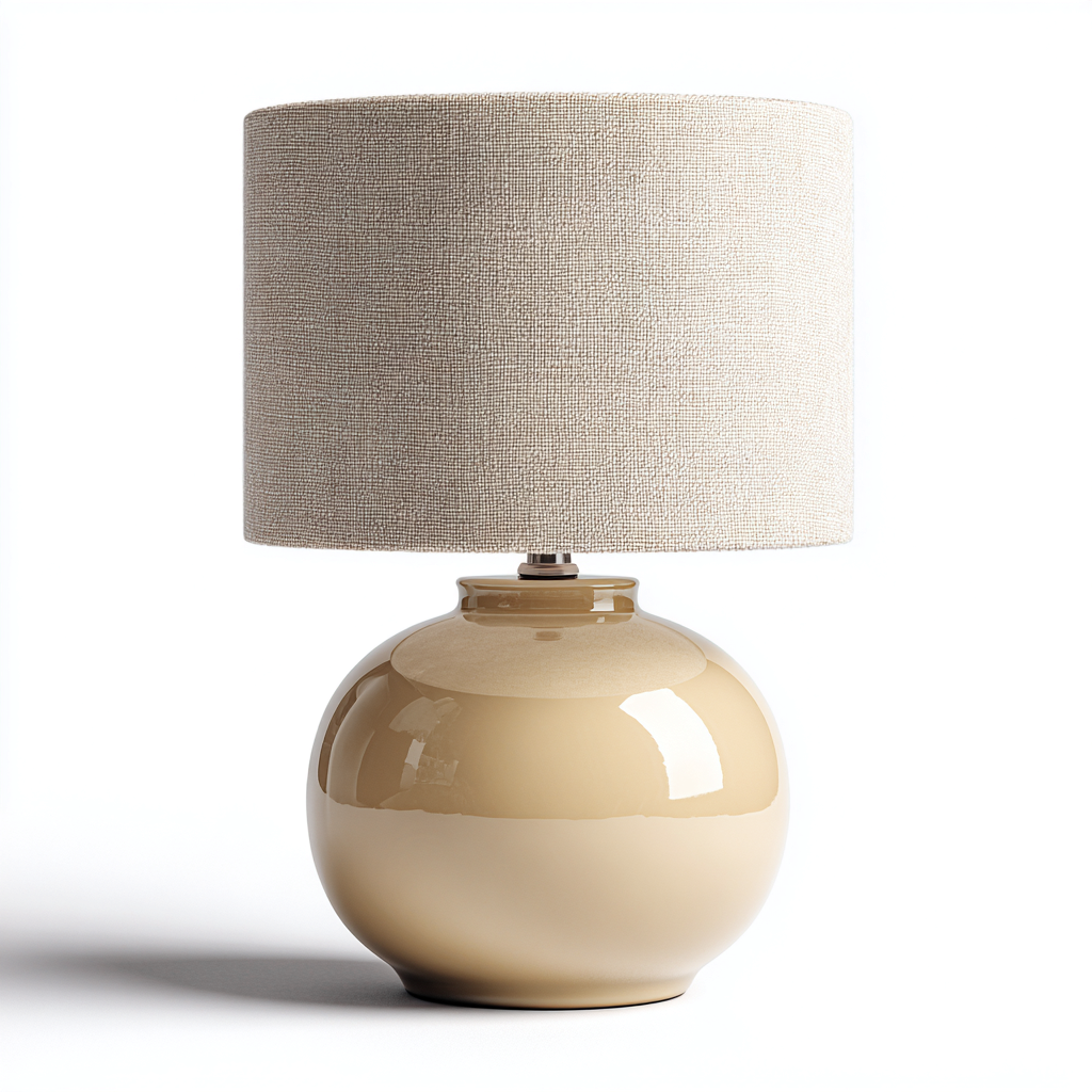 La lampada da tavolo presenta una base in ceramica lucida dal colore beige morbido, caratterizzata da una forma tondeggiante elegante e decorativa.