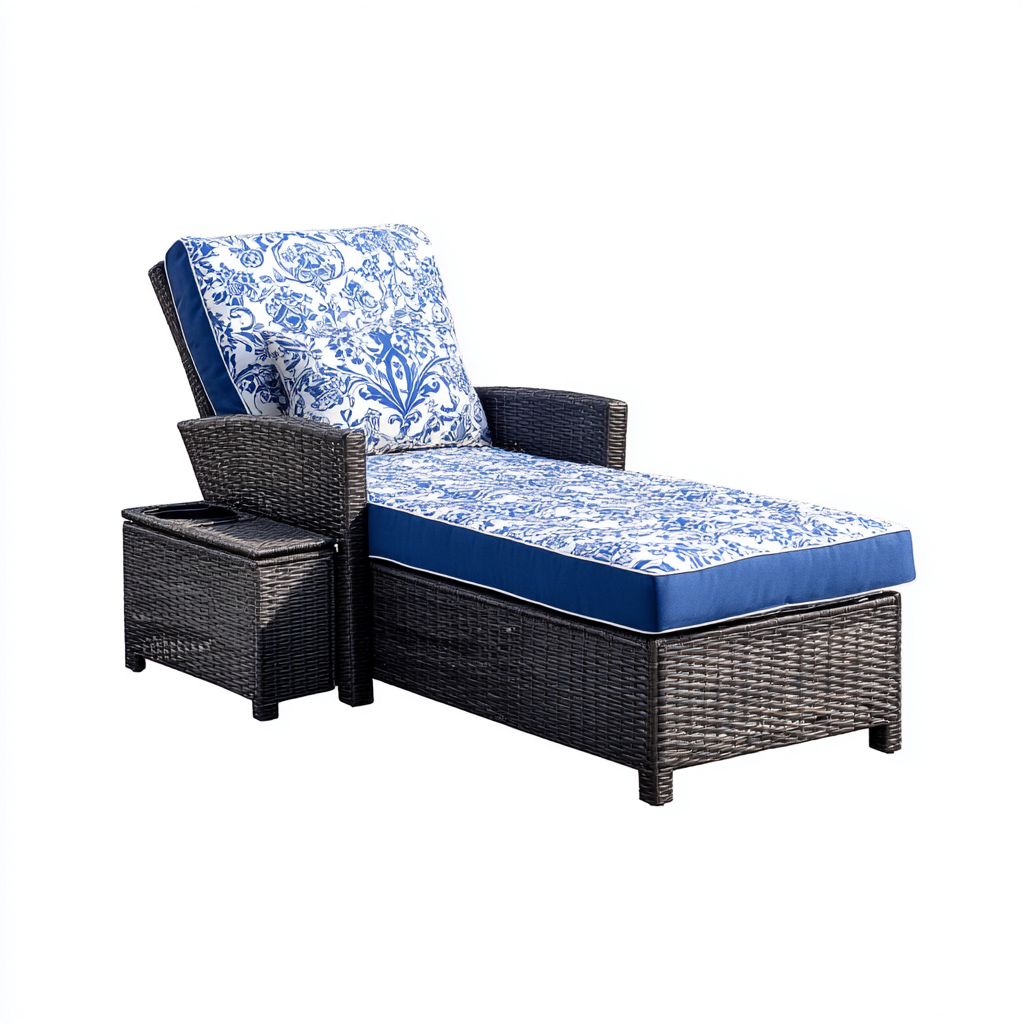 Il lettino è realizzato in rattan sintetico intrecciato con supporto in metallo. Il cuscino imbottito presenta rivestimento in tessuto blu e bianco a motivi decorativi, con base grigio scuro, garantendo comfort e buona resistenza all'uso esterno.