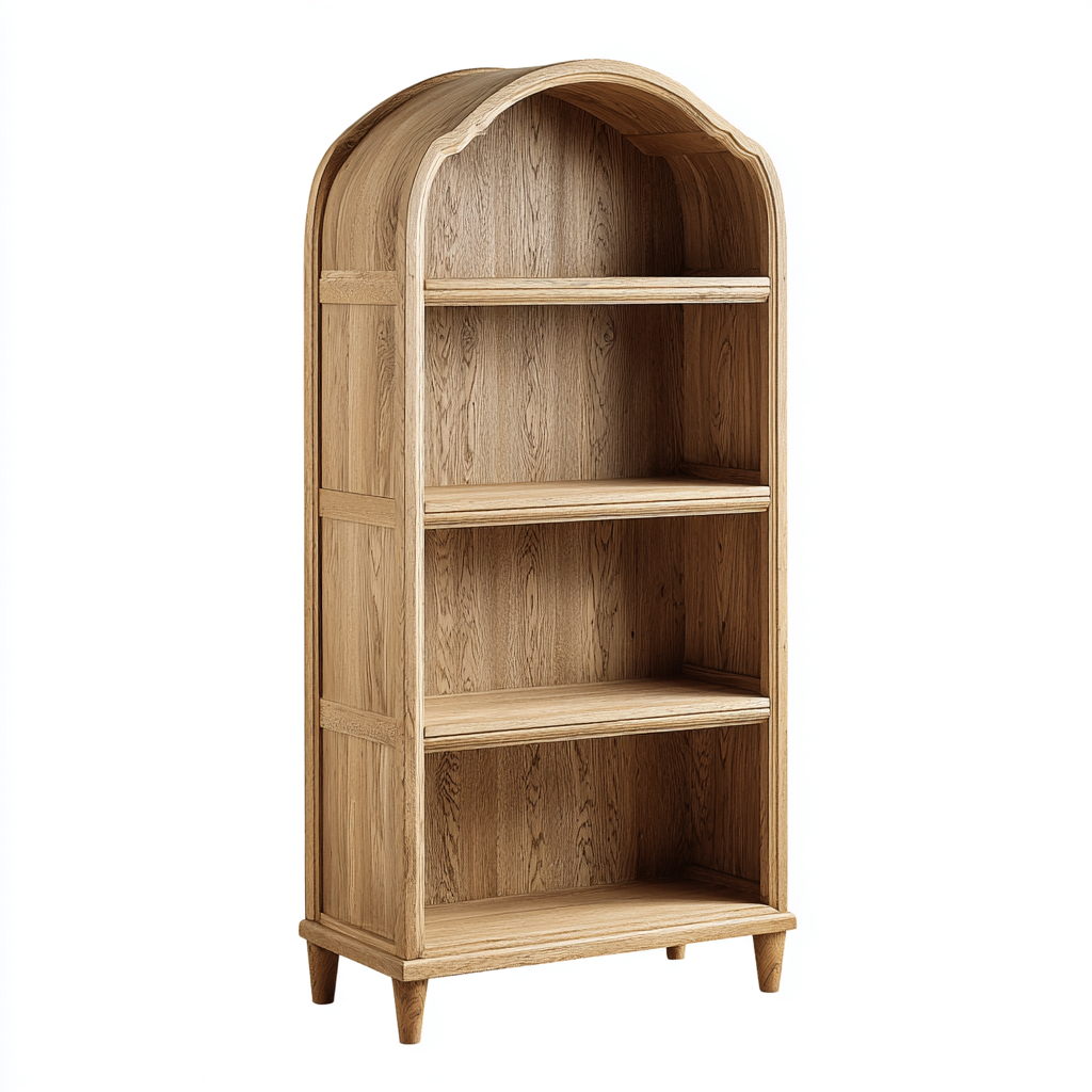 Libreria in legno con arco superiore decorativo, ideale per aggiungere un tocco caldo e naturale agli ambienti domestici.