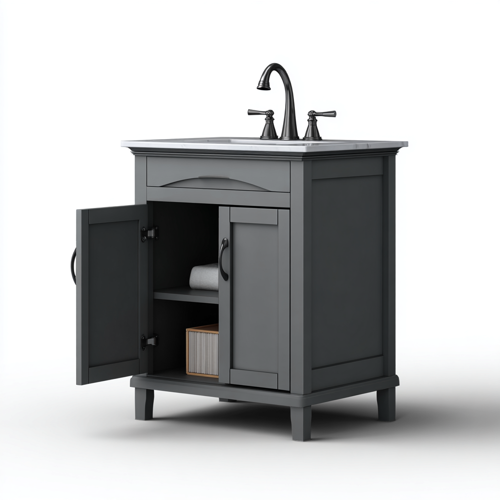 Questo mobile lavabo in legno grigio scuro combina estetica tradizionale e funzionalità moderna, ideale per bagni che richiedono uno stile sobrio ma elegante.