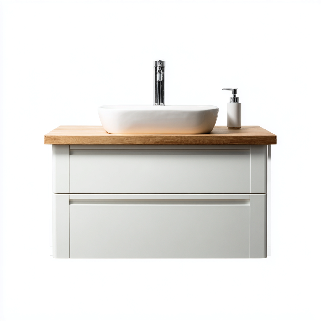 Questo mobile lavabo sospeso con lavabo da appoggio unisce estetica moderna e funzionalità, offrendo una soluzione ideale per bagni contemporanei.