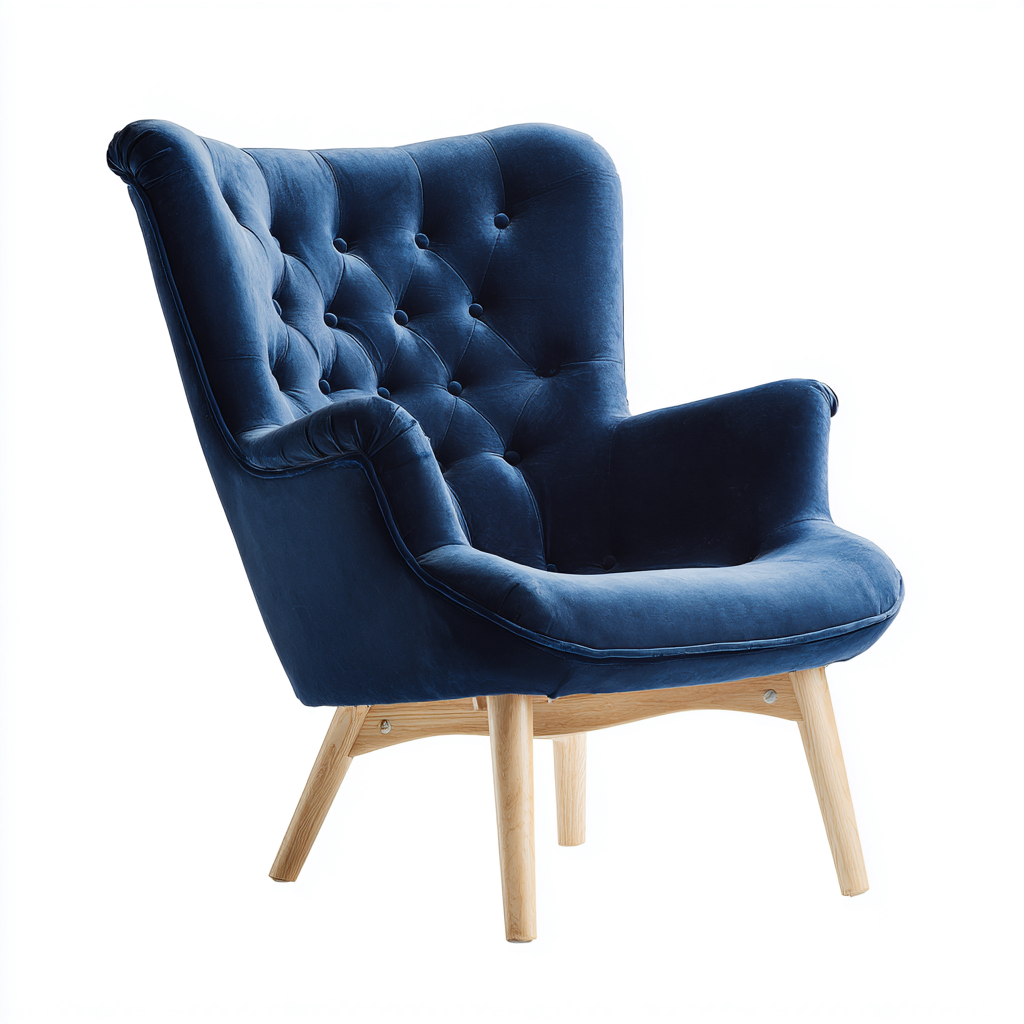 Questa poltrona in velluto blu presenta una silhouette classica con schienale alto e cuciture capitonné, ideale per aggiungere un tocco di eleganza al soggiorno.