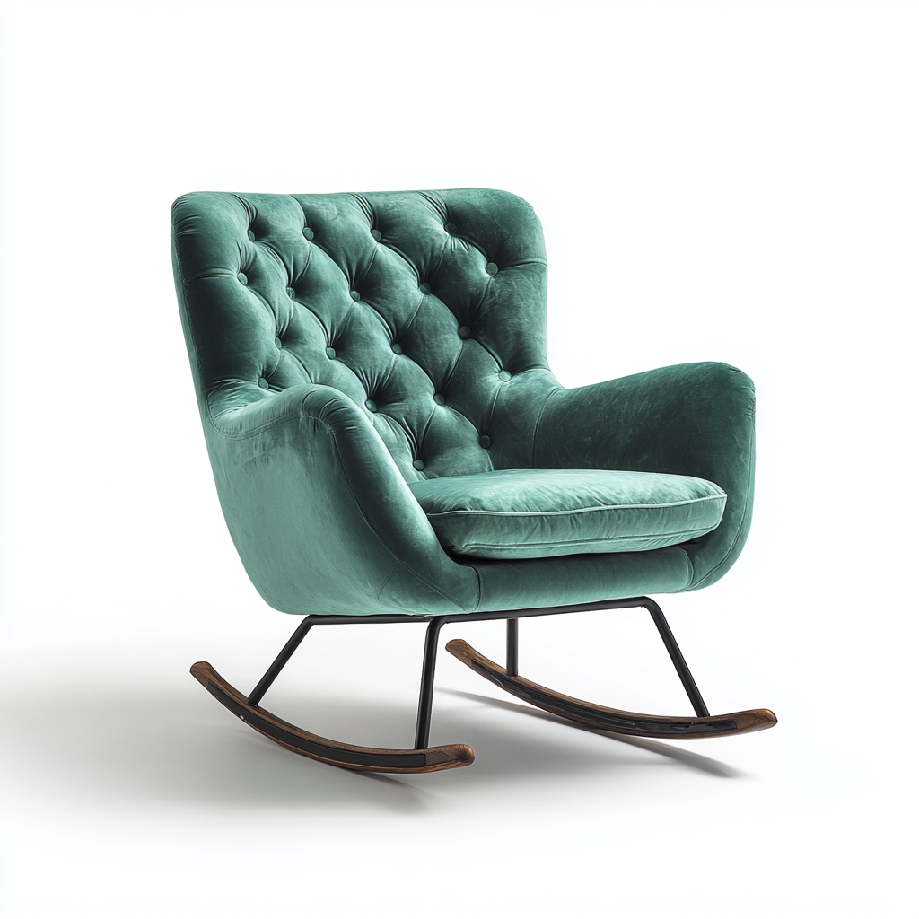 Questa sedia a dondolo in velluto verde offre un'eleganza classica unita a una seduta confortevole, ideale per ambienti dedicati al relax.