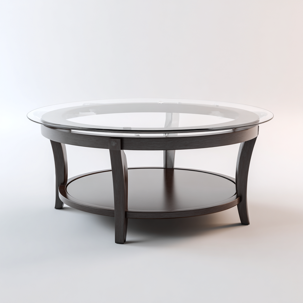 Questo tavolino da caffè rotondo combina un piano in vetro trasparente con una struttura in legno scuro, offrendo un'estetica elegante e contemporanea per il soggiorno.