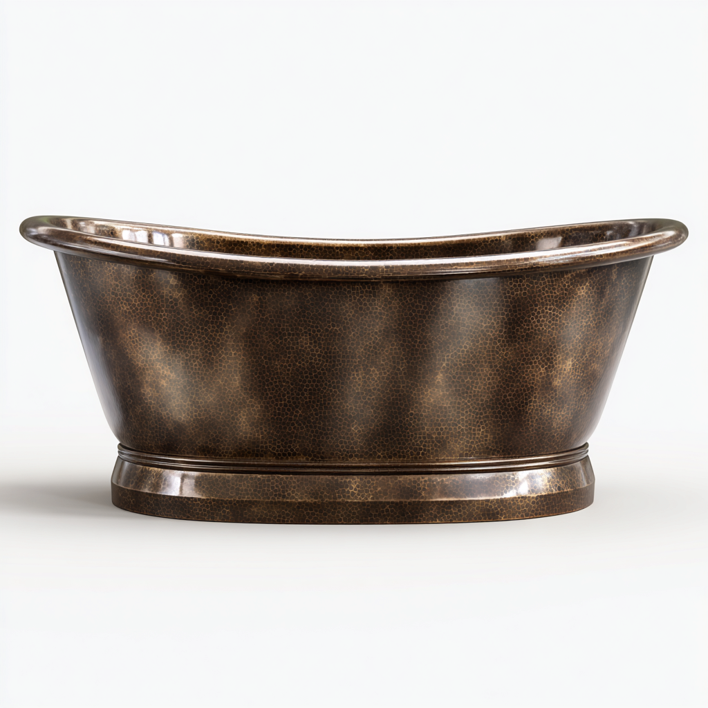 Realizzata in rame con trattamento superficiale bronzo antico, la vasca offre una texture ricca e una resistenza elevata all'usura. La finitura martellata ne esalta l'estetica artigianale e garantisce un aspetto unico.