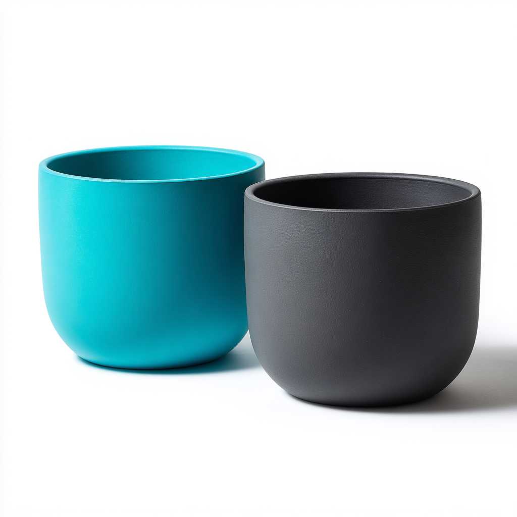 I vasi sono realizzati in plastica robusta con finitura opaca nei colori turchese e grigio, caratterizzati da una forma tondeggiante che garantisce stabilità.